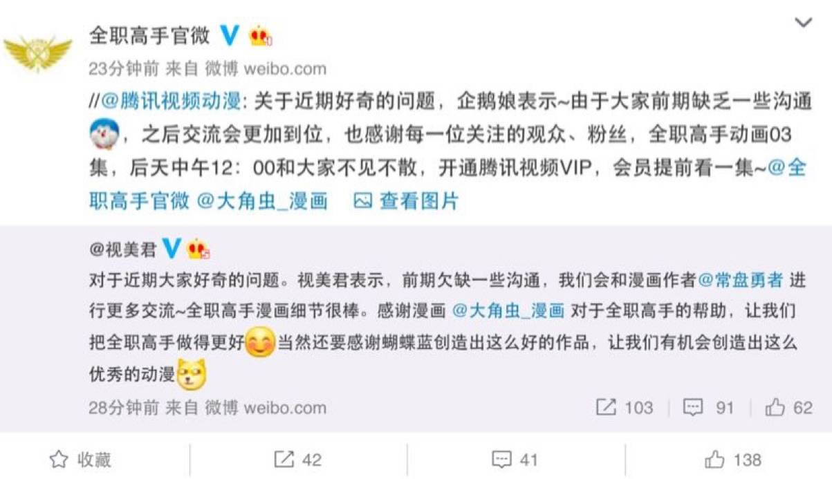 面对网友的质疑,对此,全职高手官微在当天晚上就做出了及时回应,称会及时与动画制作公司确认,等待回复,第二天官方回应了本次抄袭事件,并作出了澄清公告。